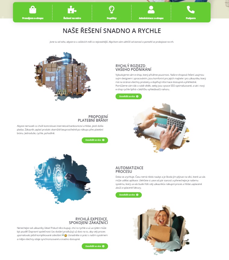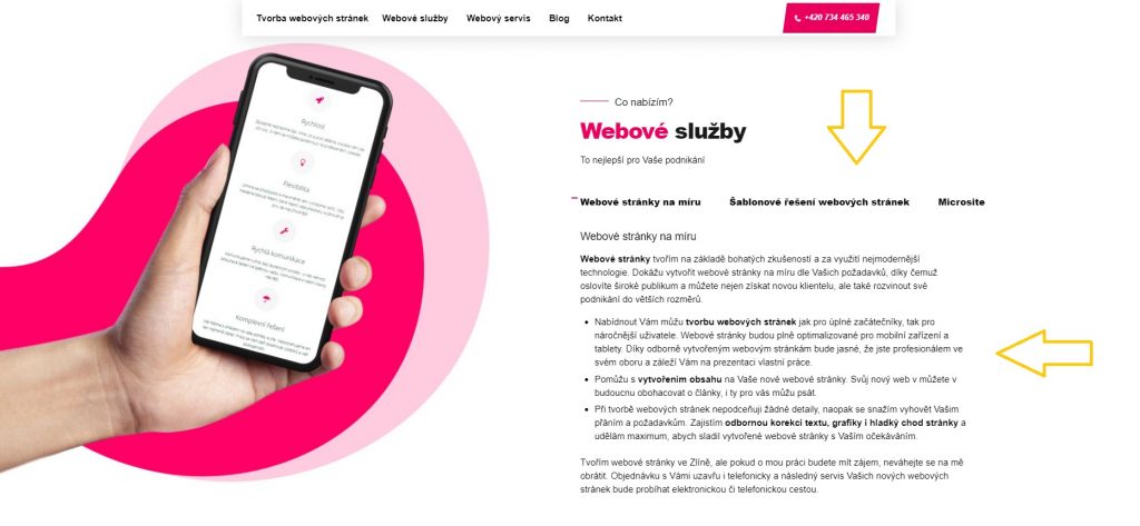 A do třetice neméně důležitý prvek webdesignu – text. Ano, text prodává, ale ani s ním to nepřežeňte. Text čleňte na odstavce, důležité věci vyznačte tučně, pro lepší čtení, větší interaktivou (a v neposlední řadě také pro lepší SEO optimalizaci) se nebojte do textu zakomponovat prolinky do dalších rubrik, na konkrétní produkty nebo na podstránky.